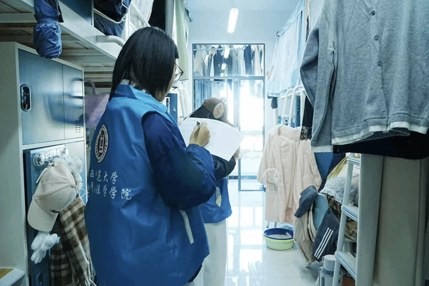 检查过程中,志愿者与同学们进行贴心交流,认真听取了大家对宿舍管理的意见和建议。他们重点排查宿舍内是否存在违规电器、私拉乱接电线等安全隐患,并对环境卫生、物品摆放、宿舍文化氛围等方面进行了细致检查。