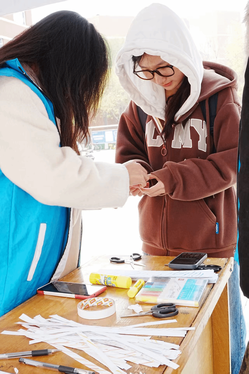 “桌畔智趣”则尽显雅趣。志愿者们写下灯谜,瞬间点燃了全场的解答热情,现场洋溢着文化共鸣与友好互动。