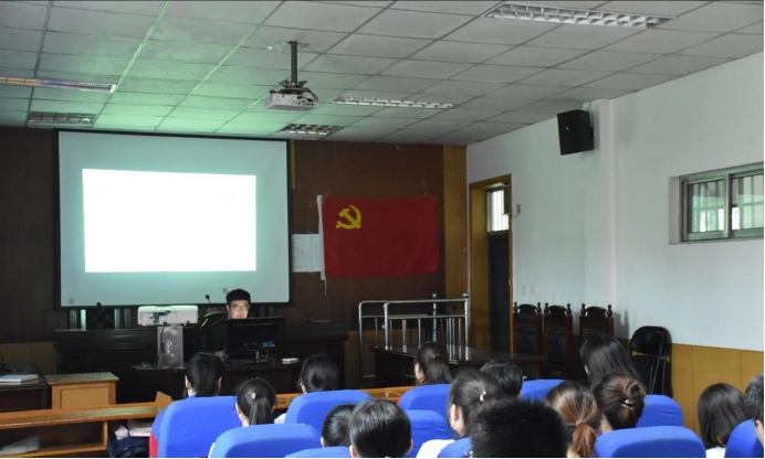 在模拟法庭举行入党积极分子培训系列课程,由安晖老师、乔巧巧老师做主讲人。
