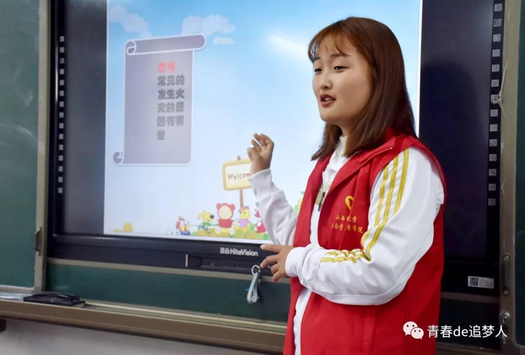 附属小学门前集合、清点人数、分配任务,并在学校负责人的带领下走进了教室。活动开始,首先,志愿者们通过讲解消防ppt,给孩子们宣传普及了消防知识;通过开展消防知识问答,给答案正确、回答积极的孩子发放消防徽章,拉近了与志愿者与孩子们的距离。随后,志愿者们还给同学们发放了有趣的消防卡片,希望通过寓教于乐的形式,来提高孩子们学习的积极性。最后,大家与同学们一起进行了合影留念。