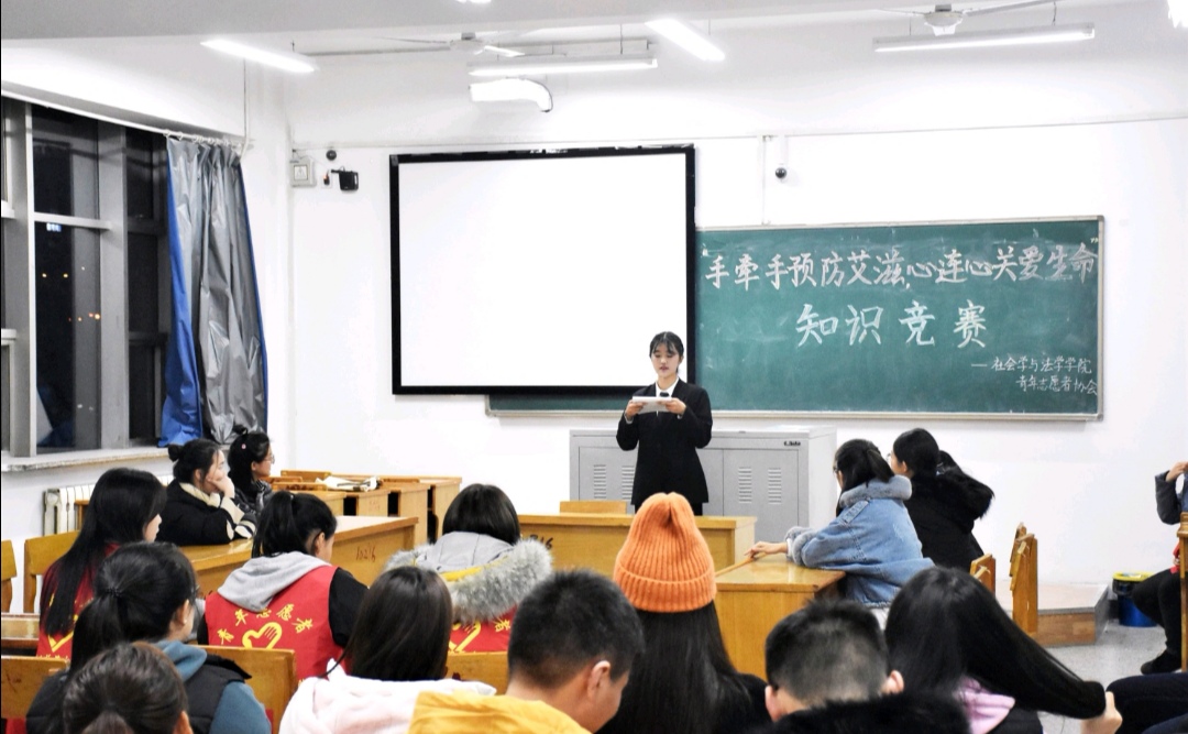 青年志愿者协会在10216教室举办了以“手牵手预防艾滋,心连心关爱生命”为主题的艾滋病知识竞赛活动。