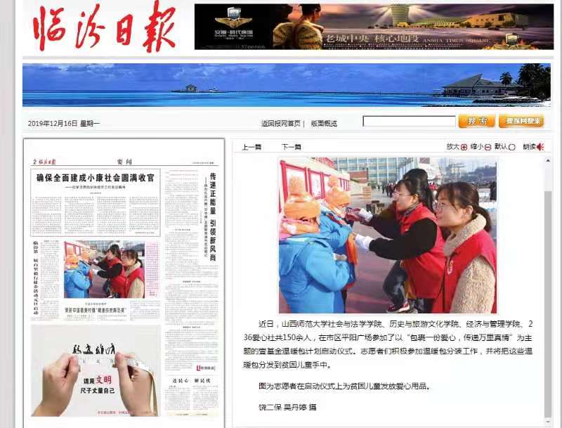 临汾日报 报道禁漫屋 青年志愿者协会参加壹基金温暖包分装仪式