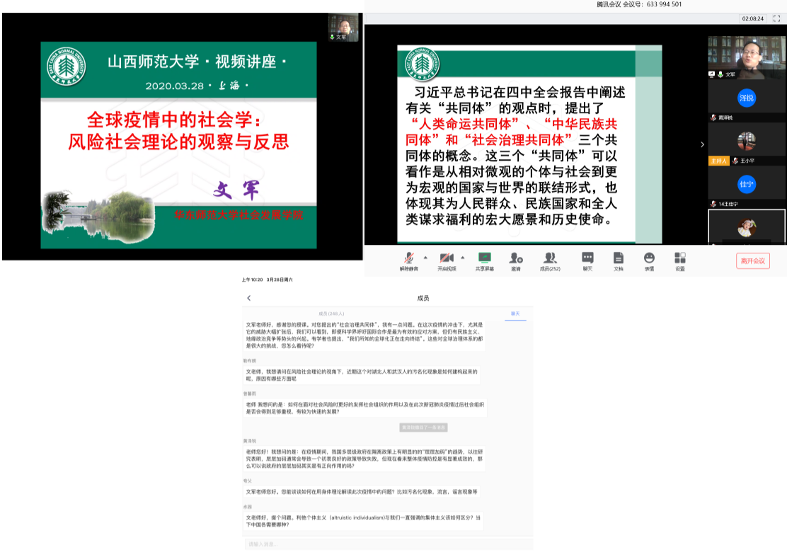 师生在腾讯会议APP上进行了以“全球疫情中的社会学:风险社会理论的观察与反思”为题的视频学术报告。社法学院师生200余人聆听了此次报告。报告由王小平教授主持。