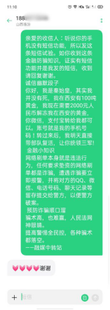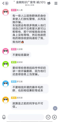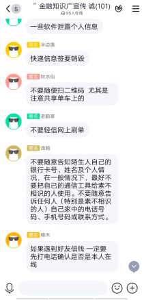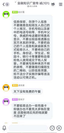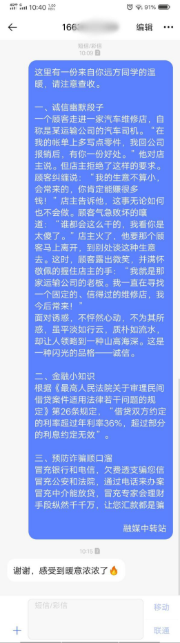 活动通知下发后,同学们予以积极回馈,纷纷将自己搜寻的各种诚信幽默段子、金融小知识以及预防诈骗的顺口溜编辑成邮件发入指定邮箱。此外,参与活动的同学们还在组建的群聊中匿名向大家分享了自己的防骗经历或被骗的亲身体会,一桩桩生动的案例不仅给大家留下深刻的印象,更为同学们敲响了被骗的警钟。最后,融媒体中心的同学以手机短信的方式向参与活动的同学随机分发了各条金融知识和防范金融诈骗的顺口溜以及小故事,为此次活动画上了圆满的句号。