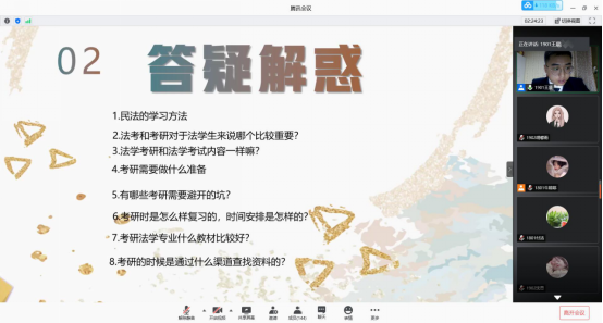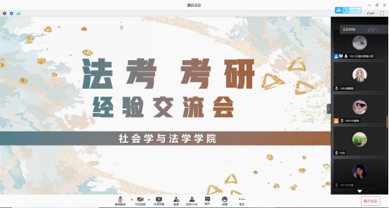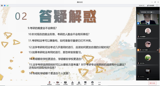 于6月24日下午在腾讯会议召开了法考、考研经验交流会。交流会邀请了几位具有相关法考考研经验的学长学姐与大家分享自己的考试经验和心得,全体法学专业学生参加了此次交流会。