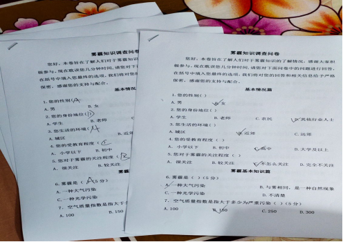 首先,我今天的调查采访工作进行较为顺利,主要走访了城镇和农村两个区域,由此产生了一些对比。城镇居民在问卷中得到的分数普遍比农村居民高一些,其中分数偏高的青年人占大多数,造成这种结果的因素有很多,比如受教育程度、宣传力度、生活习惯等等,但总体来说,随着我们现代媒体资讯的发展,每个人对于雾霾环保方面的知识都有了更多的了解,这是一个比较好的现象。