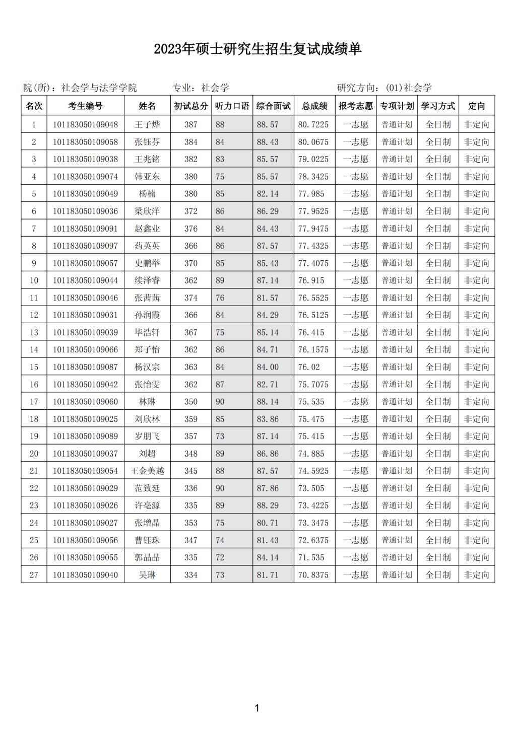 禁漫屋 社会学专业2023年硕士研究生招生复试成绩公示