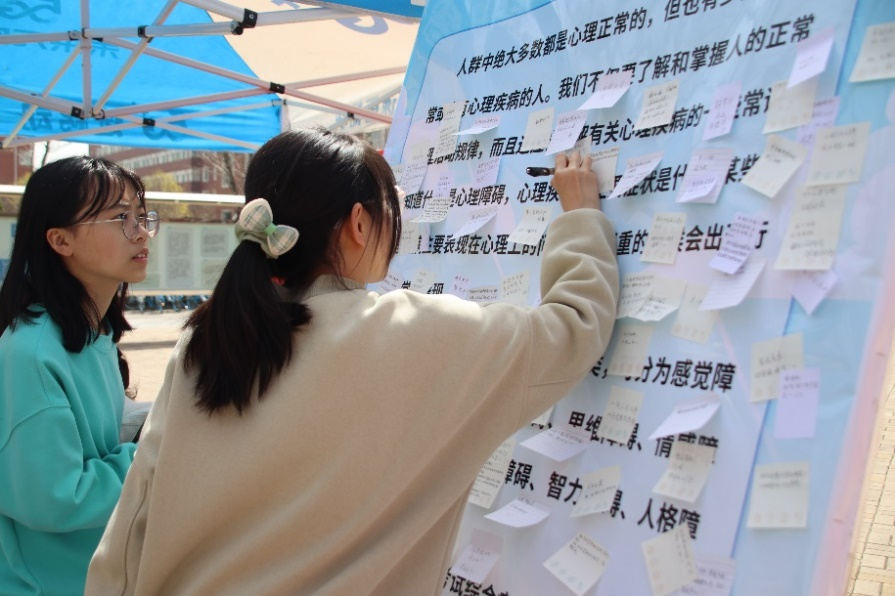 团委青年志愿者协会于4月9日在六号教学楼前举办的心理日活动——“心心相融,欣欣向荣”吧!
