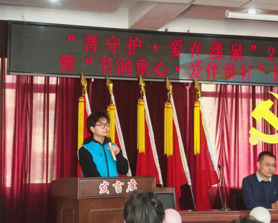 学生胡重庆作为志愿者代表上台发言并带领全体志愿者庄严宣誓,表达了关爱孩子、奉献爱心的坚定决心。