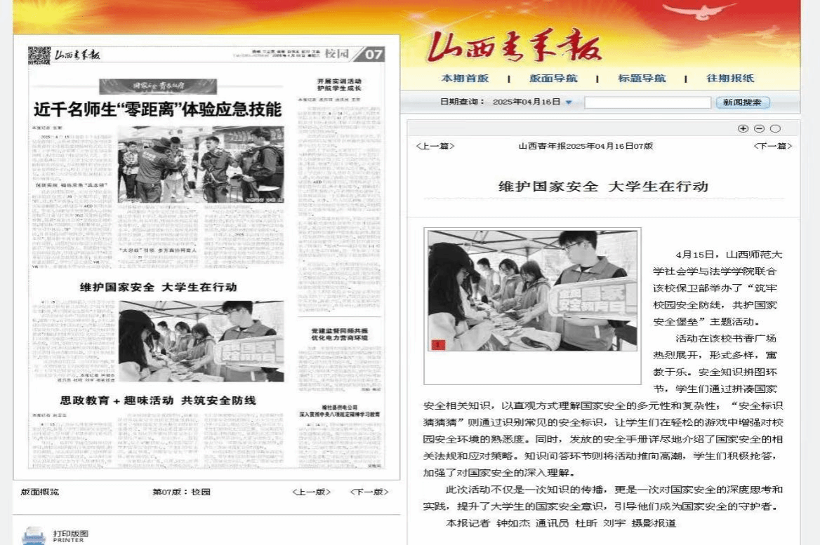 青年志愿者协会、新世纪律师团、生活权益部联合校保卫部,在书香广场举办了国家安全日系列活动。山西青年报、山西日报对此次活动进行报道。