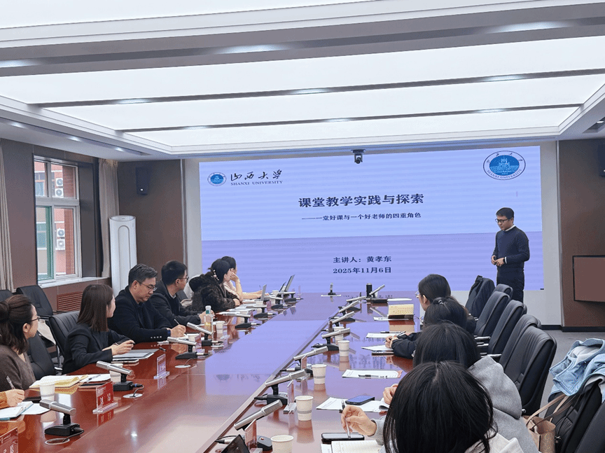 特邀第六届全国高校青年教师教学竞赛一等奖获得者、山西大学黄孝东副教授来院作题为《课堂教学实践与探索——一堂好课与一个好老师的四重角色》的专题讲座。讲座由学院副院长单云慧主持,学院部分教师代表参会聆听学习、交流探讨。